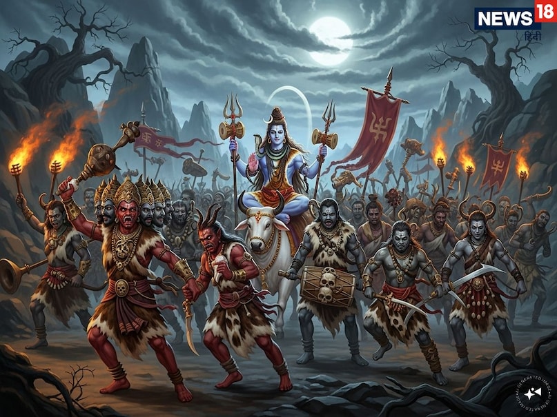 भगवान शिव की बारात में देवताओं के साथ ही यक्ष, गंधर्व, अप्सराएं, किन्नर के साथ भूत, प्रेत, पिशाच, योगिनियां और शिवगण भी शामिल थे. शिवगणों का रूप देखकर सब हैरान रह गए, किसी का मुख नहीं था तो किसी के चार आंखें या कई मुख थे. किसी के कई हाथ-पैर थे तो किसी के एक भी नहीं. कोई बहुत मोटा, कोई दुबला-पतला. सांप-बिच्छू, जानवर भी बारात में शामिल थे.