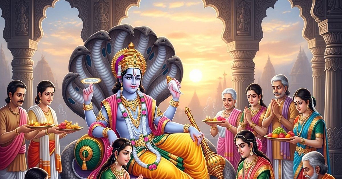 शांताकारं भुजंगशयनं पद्मनाभं सुरेशं, विश्वाधारं गगन सदृशं मेघवर्णं शुभांगम्।