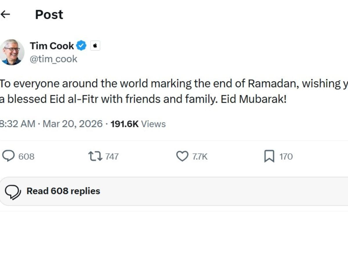 एप्पल (Apple) के सीईओ टिमोथी डोनाल्ड कुक (टिम कुक) ने भी लोगों को ईद की मुबारकबाद दी है. टिम कुक ने एक्स पर एक ट्वीट किया है, जिसमें उन्होंने लिखा है, रमज़ान के समापन का जश्न मना रहे दुनिया भर के सभी लोगों को, दोस्तों और परिवार के साथ ईद-उल-फितर की मुबारकबाद! ईद मुबारक!