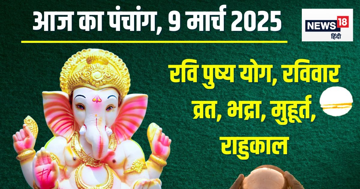 आज का पंचांग, 9 मार्च 2025: आज रवि पुष्य समेत 5 शुभ बने हैं और रविवार व्रत भी है. आज फाल्गुन शुक्ल दशमी तिथि, पुनर्वसु नक्षत्र, सौभाग्य योग, गर करण, पश्चिम का दिशाशूल और मिथुन में चंद्रमा है. आज के दिन रवि पुष्य योग, रवि योग, सर्वार्थ सिद्धि योग, सौभाग्य योग और शोभन योग का अद्भुत संयोग बना है. रवि पुष्य योग सुख, समृद्धि, सफलता आदि में बढ़ोत्तरी करने वाला माना जाता है. इसमें सोना, प्रॉपर्टी, गाड़ी आदि की खरीदारी करना शुभ होता है. आज शाम 7:41 बजे से भद्रा लग रही है, जिसका वास स्थान मृत्यु लोक यानि पृथ्वी है. इस भद्रा में आप कोई भी शुभ कार्य न करें अन्यथा उसमें कई प्रकार की बाधाएं आएंगी और वह अशुभ फल देने वाला हो सकता है.